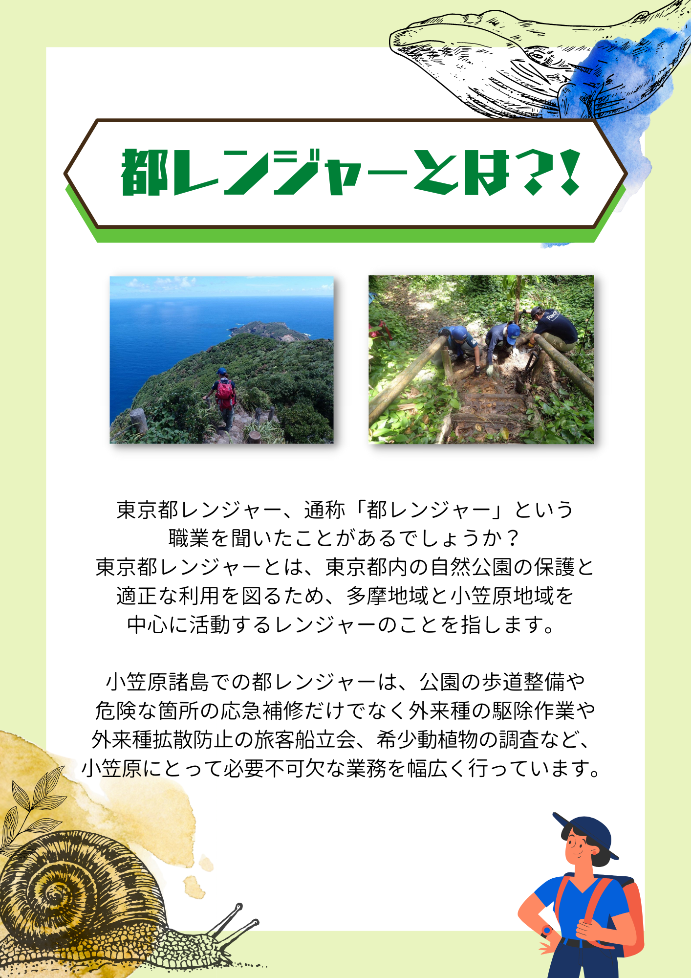 小笠原で活動する東京都レンジャー、通称「都レンジャー」が植物館にやってきます!小笠原現地の中継映像からリアルな暮らしや生物、美しい自然を教えてもらおう。植物や自然が好きなお子様を中心に、フィールドワークや南の島に興味のある大人の方など、幅広い年代の方に楽しんで頂けます。
