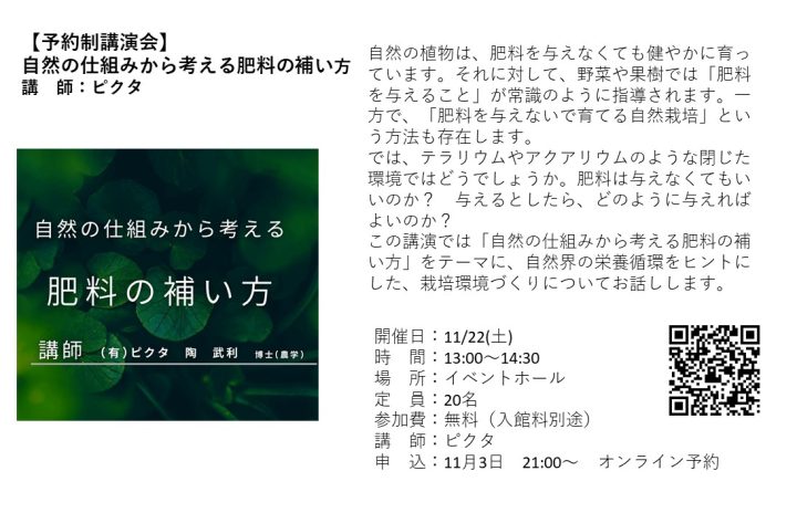 ■【予約制講演会】自然の仕組みから考える肥料の補い方 講 師:ピクタ