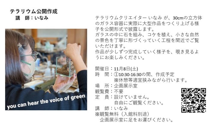 週末はワークショップやクリエイターによる実演作成、苔や植物の販売、講演も開催いたします。
