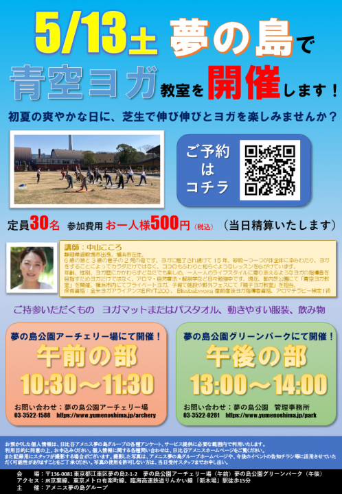 来たる5月13日(土)に、屋外芝生でのヨガ教室を開催します。