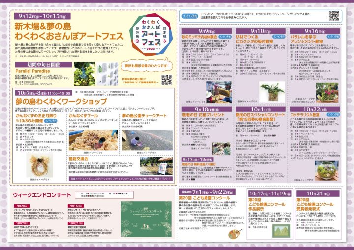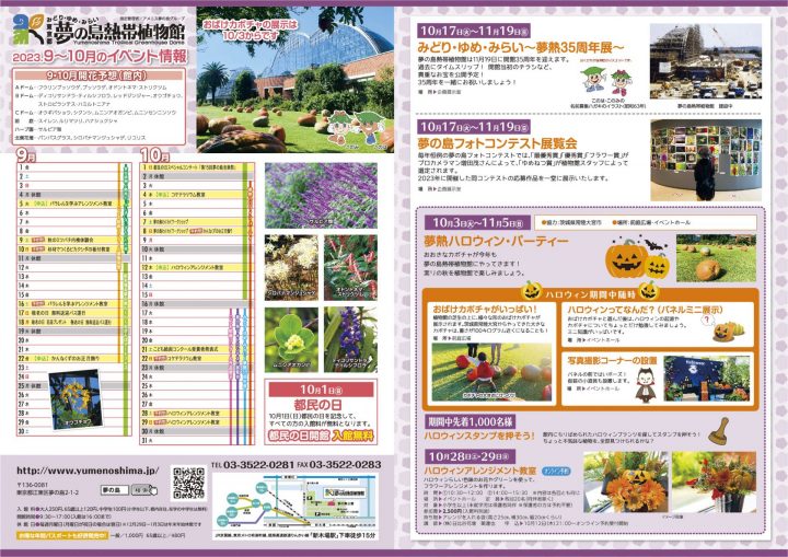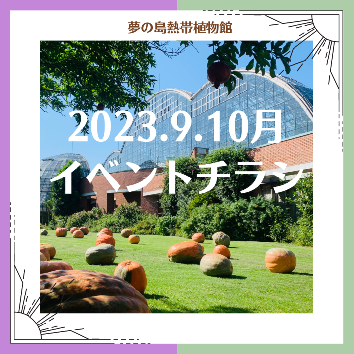 2023年08月15日 イベント 2023年秋のイベント・企画展のお知らせ 2023年9.10月のイベントと企画展のスケジュールが決定しました! 撮影スポットとして大人気、おばけカボチャが今年も植物館にやって来ます。最寄り駅を挟んだお隣の新木場エリアと夢の島エリアにアート作品が展示される「新木場&夢の島わくわくおさんぽアートフェス」も更にパワーアップ。「杉材でつくるビカクシダの板付け教室」や「コケテラリウム教室」は植物好きさん必見のお得イベントです。 表面裏面 イベントの詳細、ご予約はこちらのページから!