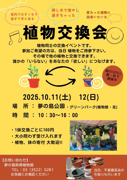 10月11日(土)開催を予定しておりました「植物交換会」は雨天のため中止とさせていただきました。