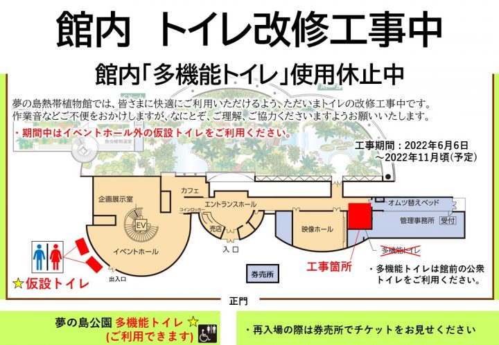 夢の島熱帯植物館では、皆さまに気持ちよく快適にご利用いただけるよう、館内のトイレの改修工事を行います。