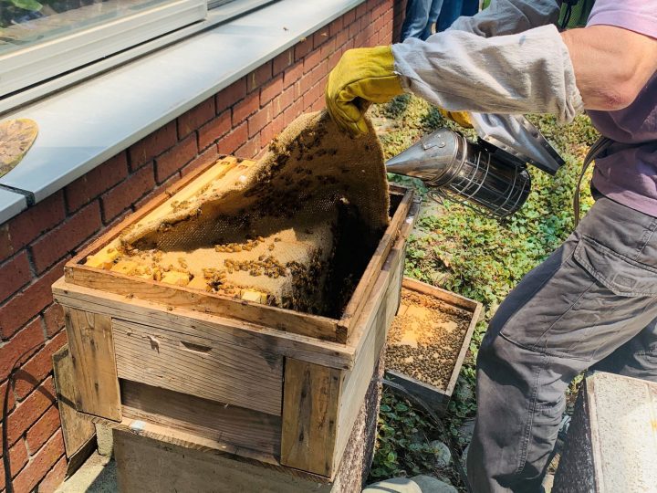 Die Untersuchung des Bienenstockinneren zur Überprüfung des Wachstumsstatus der Bienen wird als „Inneninspektion“ bezeichnet. Warum beobachten Sie nicht mit Herrn Arano, einem Imker, den Zustand der Bienenköniginnen und Arbeitsbienen?