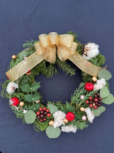 Machen Sie einen Weihnachtskranz aus verschiedenen Arten immergrüner Pflanzen.