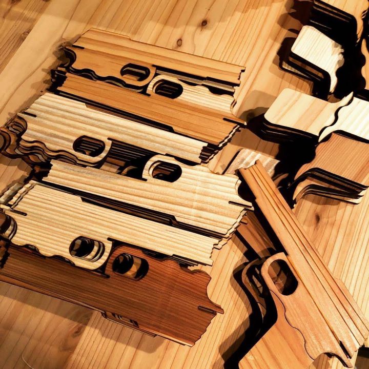 Dies ist ein Workshop, in dem Sie vier aufeinanderfolgende Holzgummibänder herstellen können. Die ausgeschnittenen Teile werden mit Klebstoff zusammengeklebt. Sie können es auch nach Ihren Wünschen einfärben.