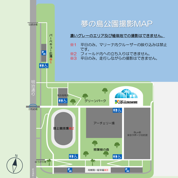 - Das Koto Ward Stadium, BumB, Marina, Green Road Park, das Gebiet um die Daigo Fukuryu Maru und die Bogenschießanlage werden separat verwaltet, sodass das Yumenoshima Park Management Office keine Genehmigung erteilen kann.