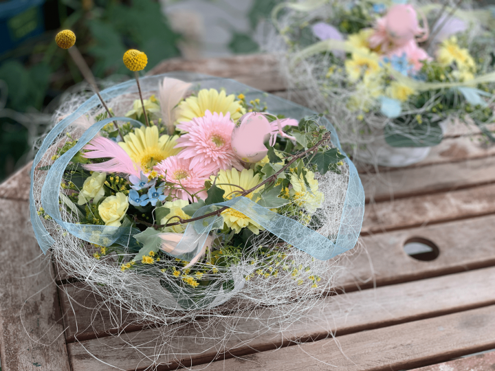 부활절을 이미지 한 배열을 만듭니다. 봄 같은 색의 꽃으로 부활절을 축하합시다.