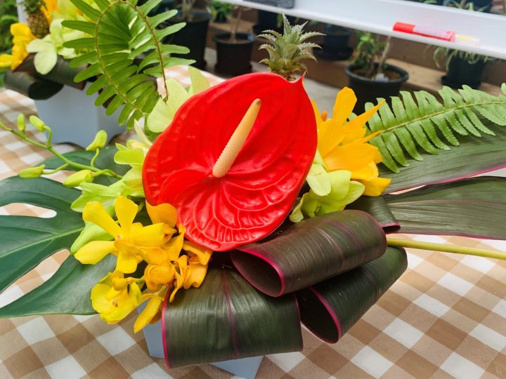 열대에 피는 꽃과 녹색을 사용한 배열을 만드십시오.