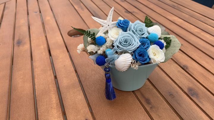 시원한 색감의 프리자브드 플라워를 사용해 어레인지먼트를 만들어 보세요.