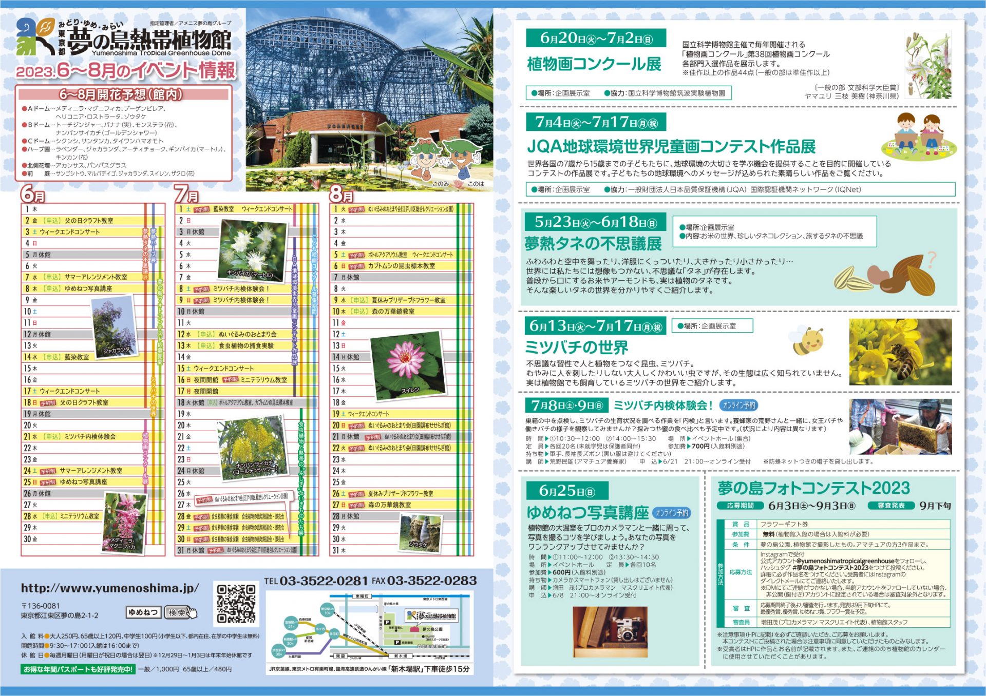 2023 年 5 月 19 日 活动 2023 年夏季活动和特别展览通知 夏季活动传单已完成!惠普会不时更新。 夏天来了,是热带植物大放异彩的季节。适合暑假自由研究的教室、特别展、一年一度的夜间开放、每年都流行的毛绒动物过夜派对等,夏天的植物园里有很多活动可以享受!